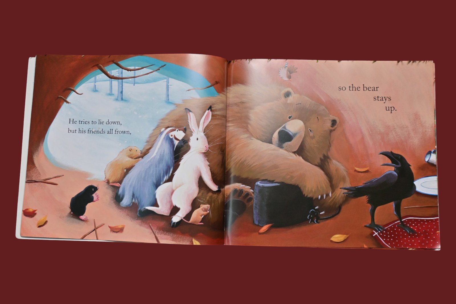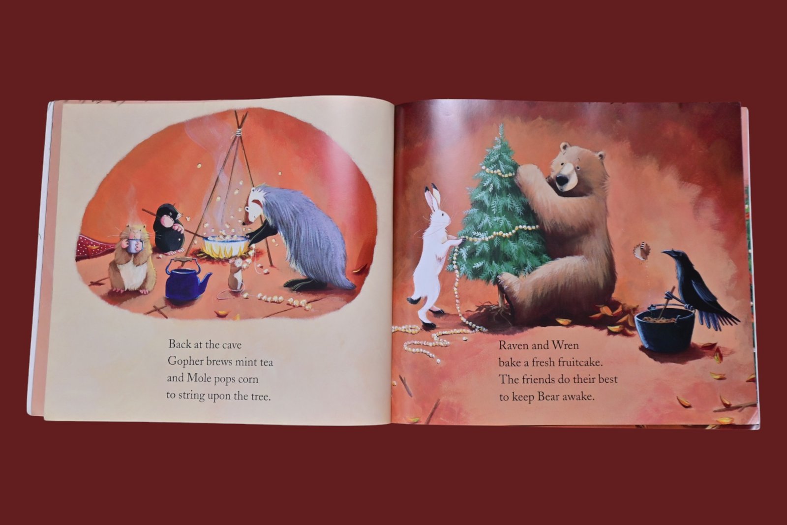 The day before Christmas, snuggled on his floor, Bear sleeps soundly with a great big snore. ‘Dear Bear. Get up ‘ Mouse shouts in his ear. ‘We won’t let you sleep through Christmas this year.’ Bear’s friends are determined that he’s awake for Christmas and they get him up from his hibernation on Christmas Eve. Bear is excited to experience the holiday with his friends and tries very hard to stay awake, helping to find the right Christmas tree, making mint tea and singing carols.
