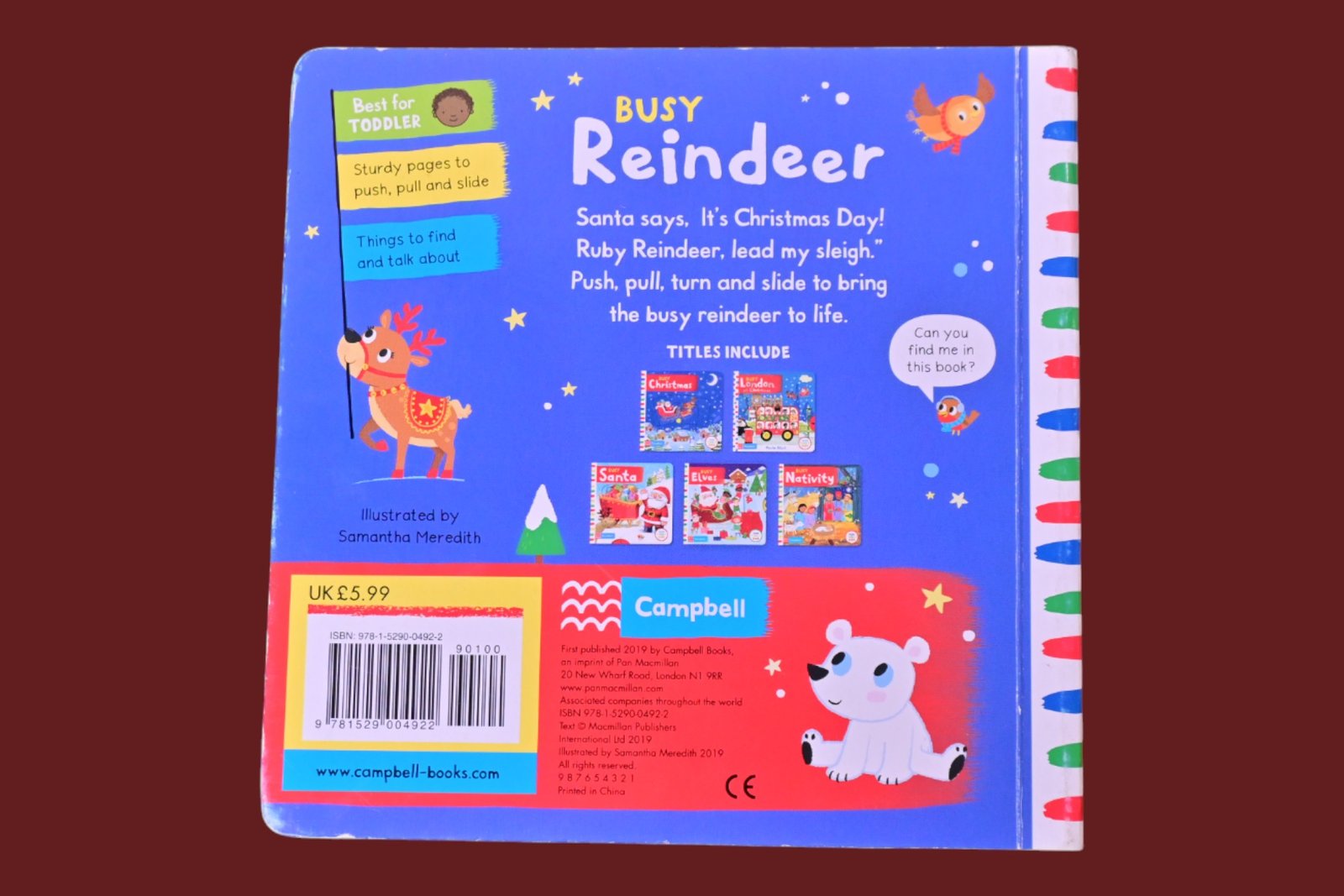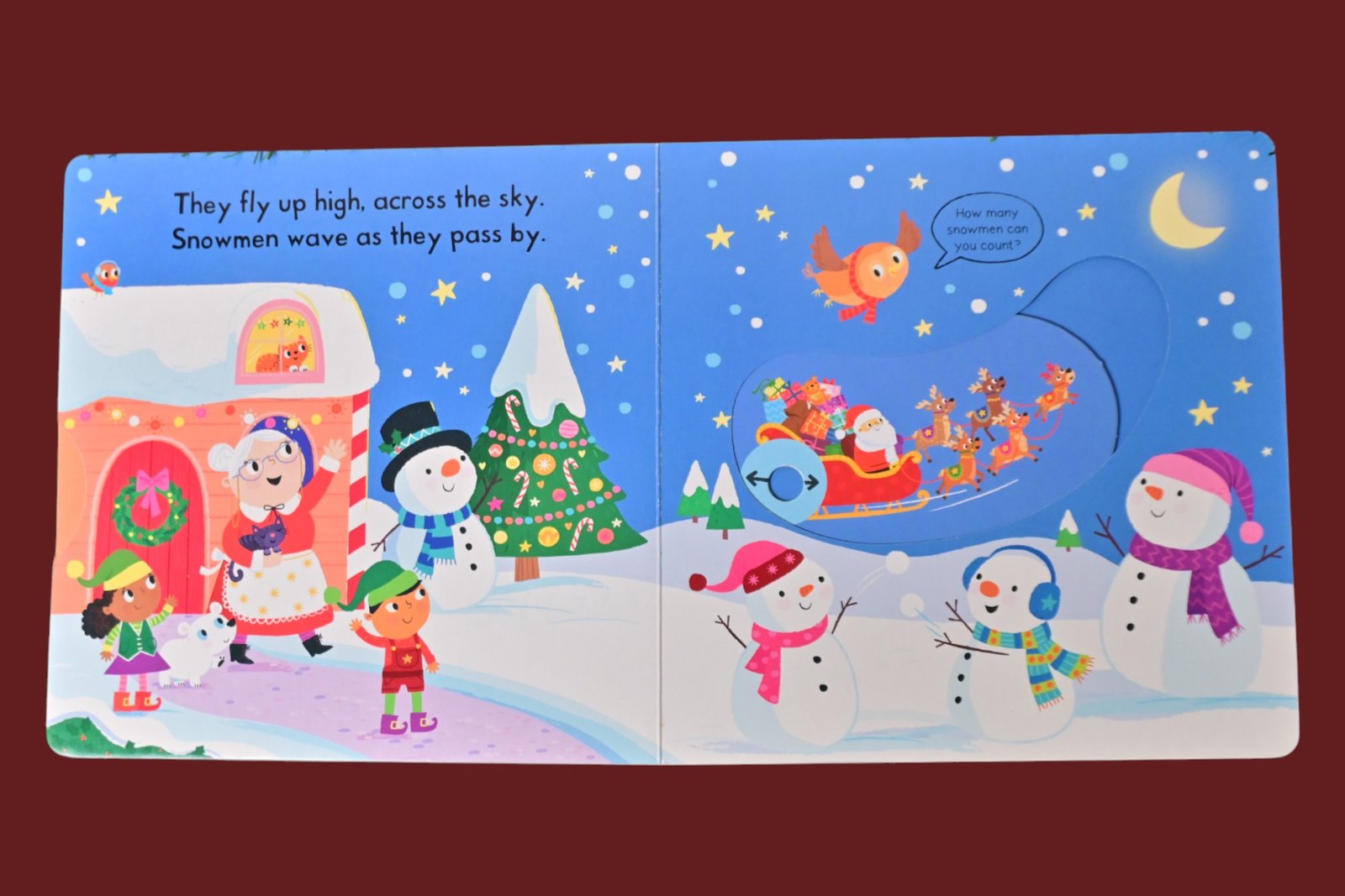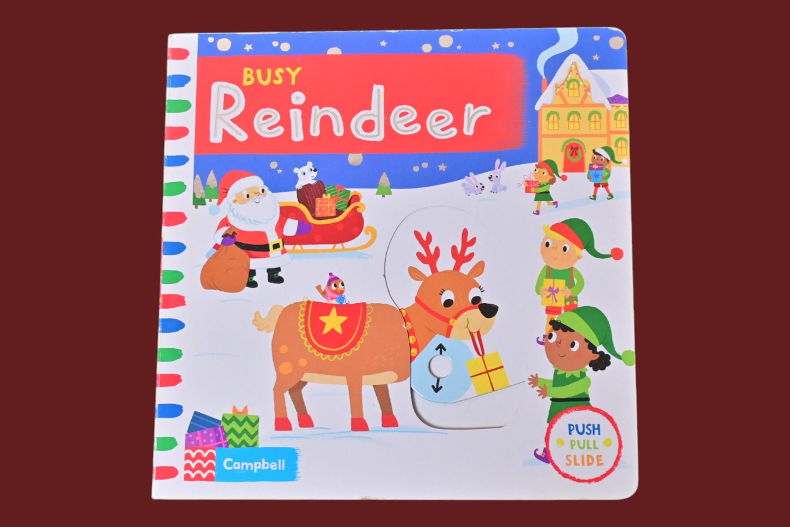 A festive novelty board book featuring Ruby Reindeer and interactive mechanisms (pull, push, turn) as she helps Santa deliver presents, with gentle rhyming text and bright, playful illustrations.
