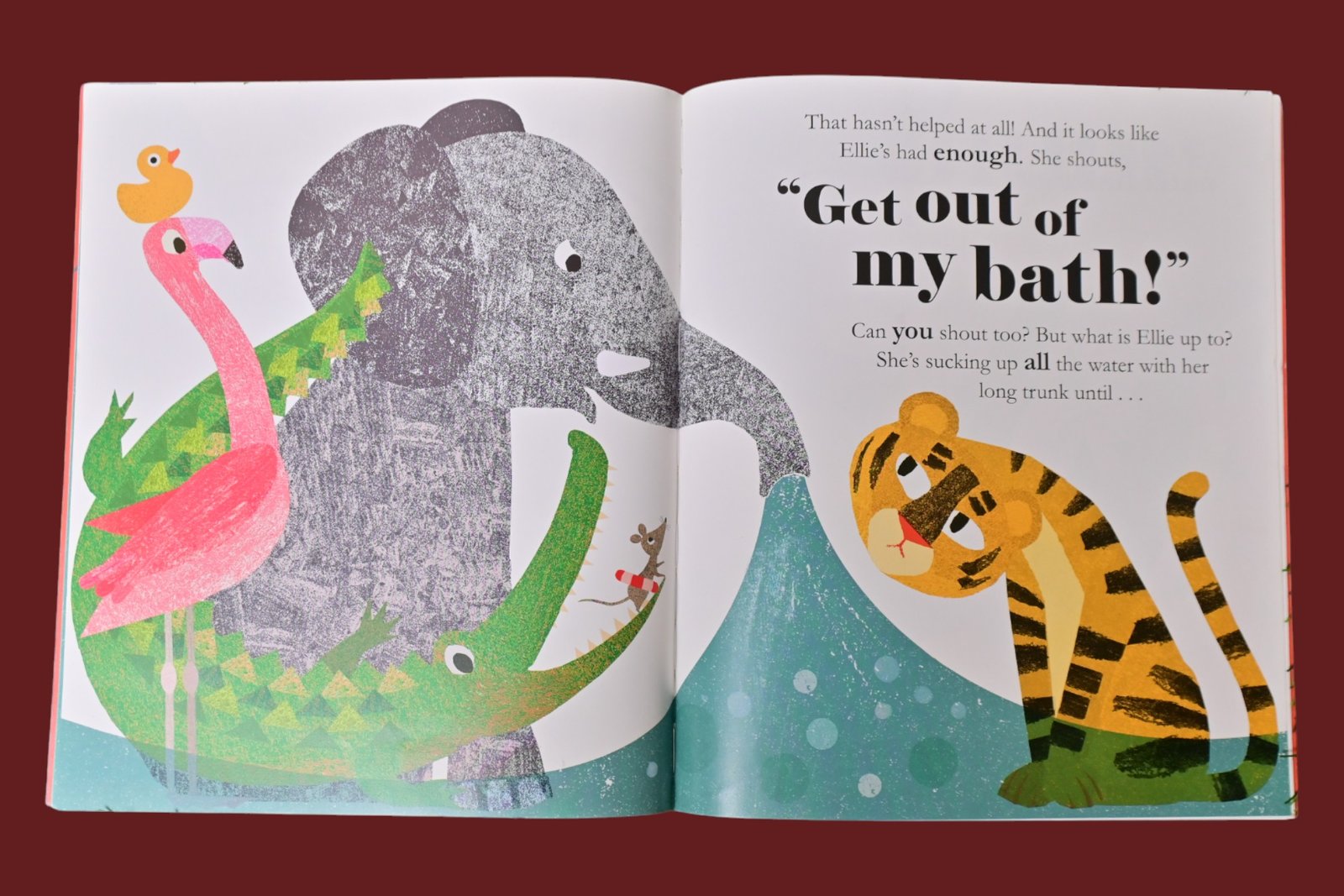 Ellie the elephant loves to have fun in the bath but she’s not the only one… Her fun is interrupted when a crocodile decides to join in followed by a flamingo, then a mouse and even a tiger! Poor Ellie’s bath is ruined. What can she do? Suck all the water into her trunk of course! Ellie waits until the uninvited animals have left before squirting the water back. Finally Ellie can enjoy her bath in peace!