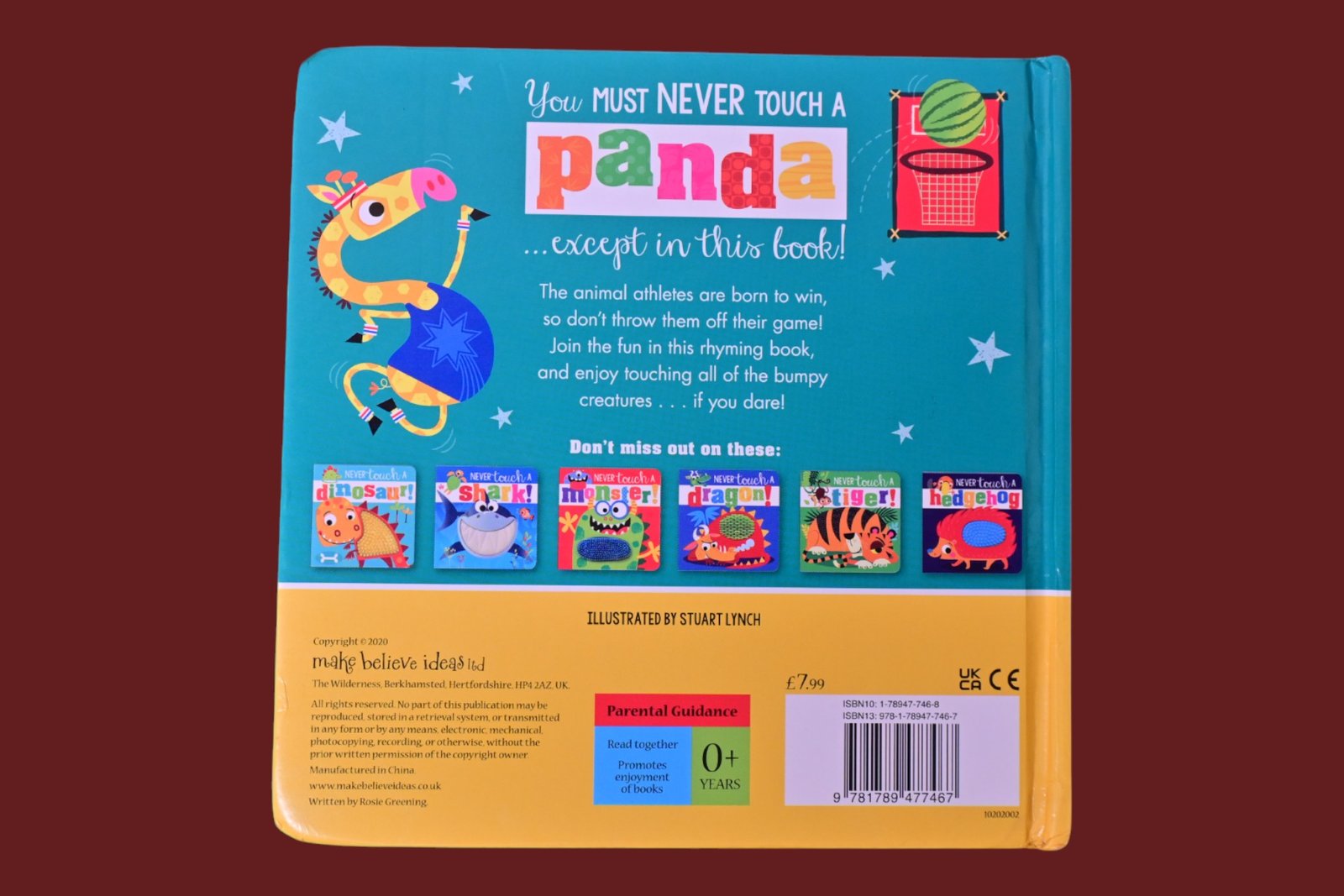 Never touch a panda… unless its in this book! This new addition to the Never Touch a… series features five sporty animals, and is accompanied by a silly rhyme that is sure to make little ones laugh! Children will love feeling the bumpy silicone touches on every page, and Stuart Lynchs funny illustrations are sure to make this a hit with all families.