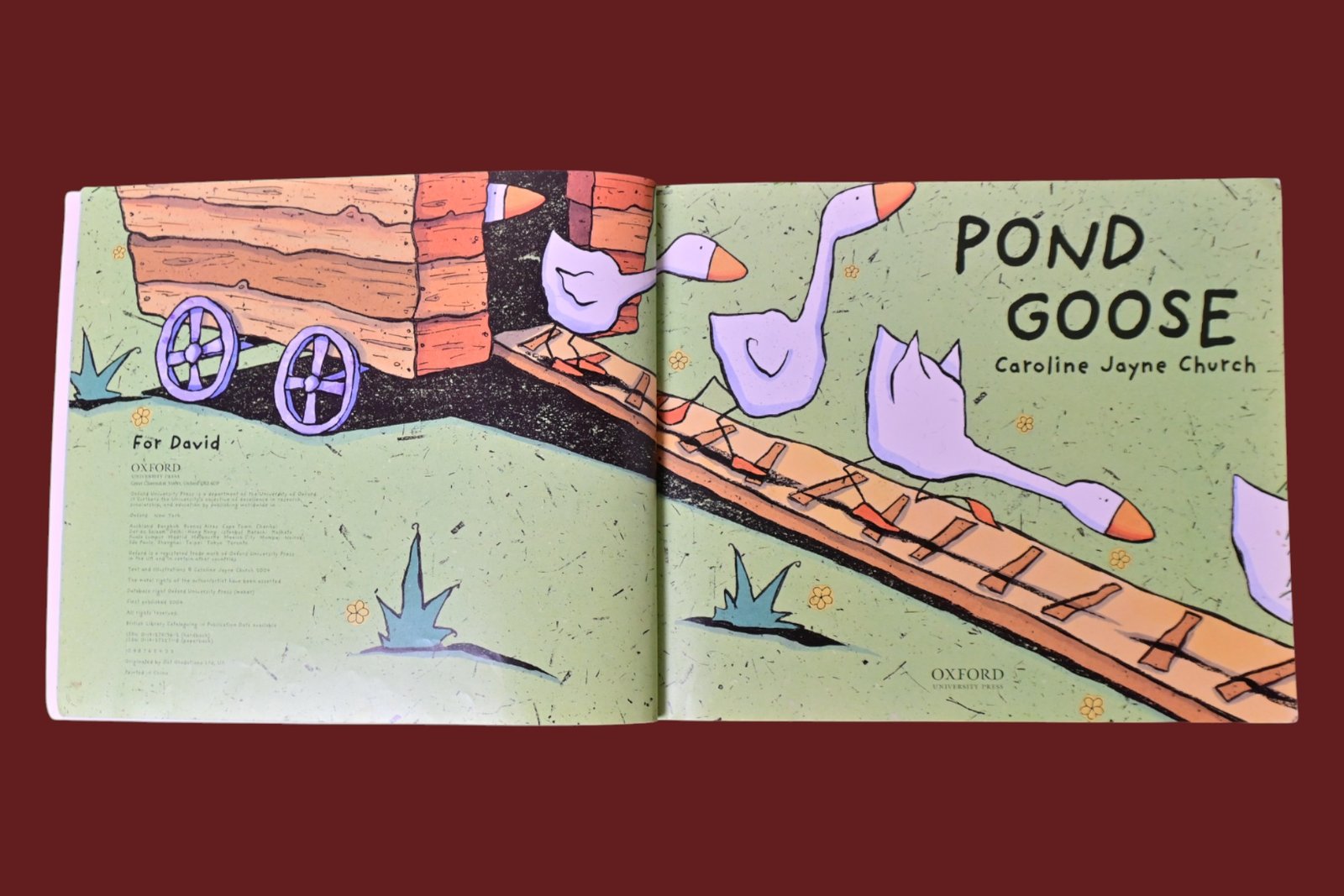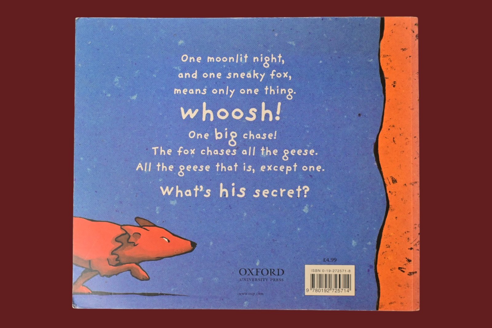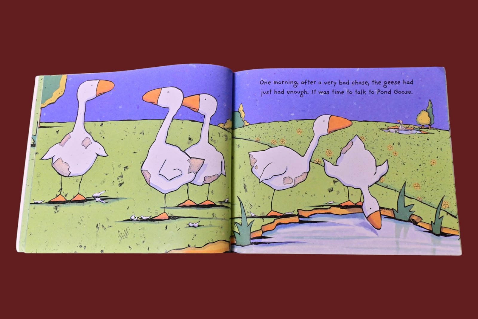 Pond Goose is an outsider on the farm, and the other geese laugh at his muddy feathers. Until one moonlit night a fox comes and chases them all down the hill – all, that is, except Pond Goose, whose muddy feathers mean he can’t be seen. A visually dramatic and humorous story, with a neat surprise ending.